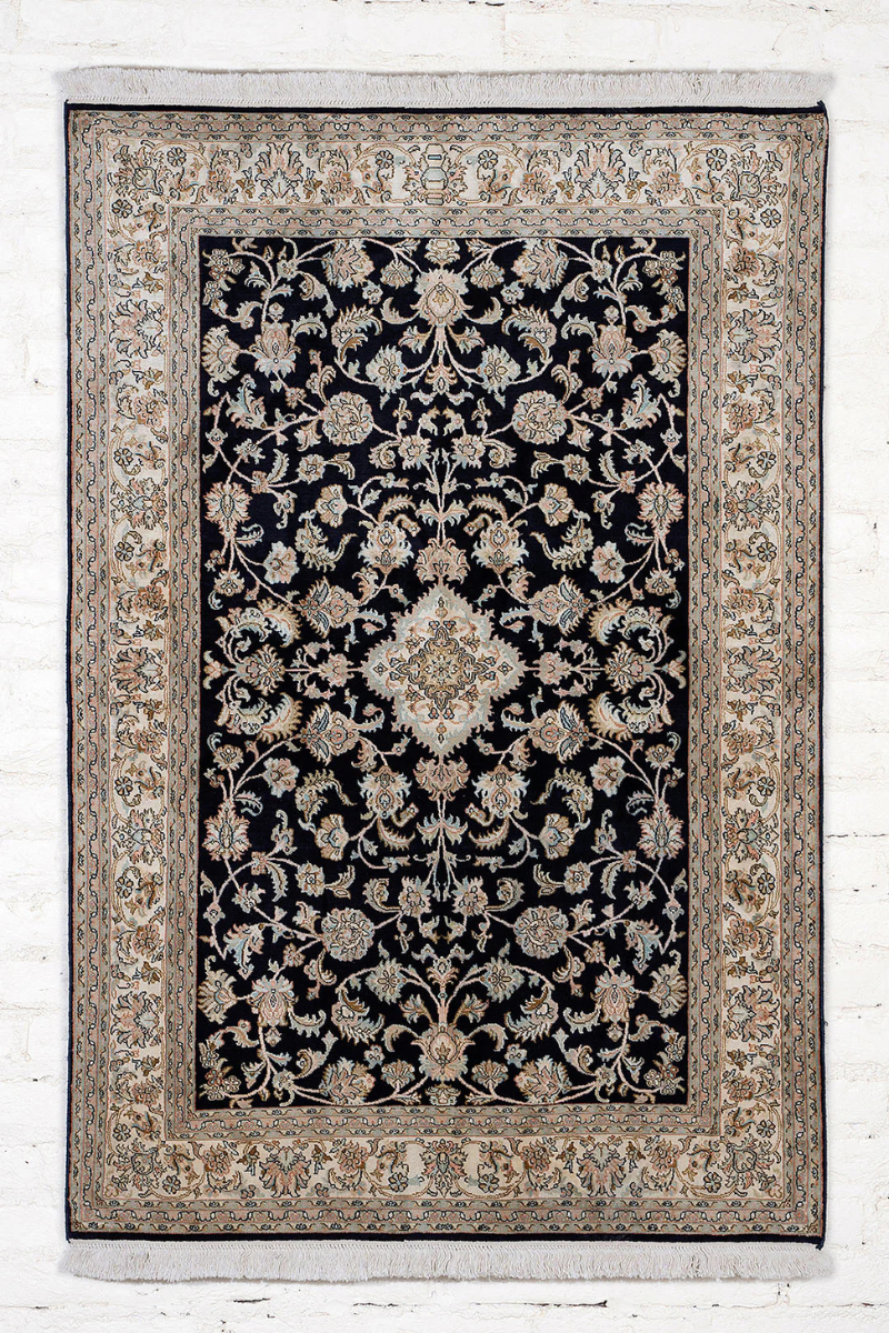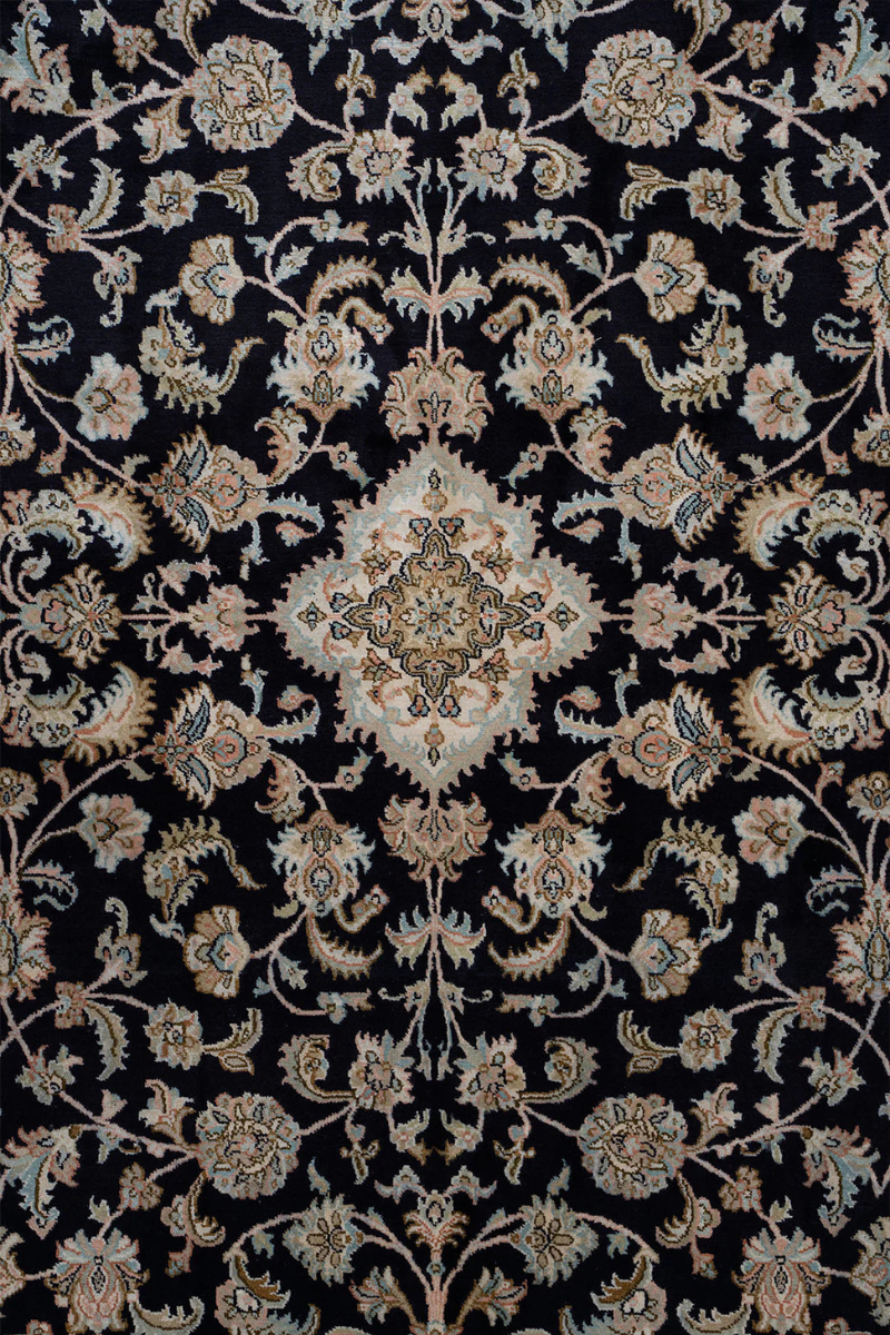 A premium silk carpet with a classic blue medallion design, handcrafted in Kashmir for a luxurious and timeless look.